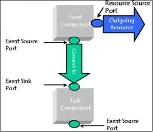 An event component has two ports, an Event Source and Resource Source. The Event Source port triggers downstream task components whenever the event fires, and the Resource Source port makes the data from this component available for use by one or more downstream components.