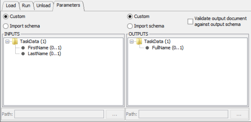 The variables "input" and "output" will only be defined if you haven't declared any parameters under the "Parameters" tab. If you have some parameters defined, then the variables defined will have names the same as those parameters. For example you may have defined two input parameters named FirstName and LastName, and a single output parameter named FullName, like this: